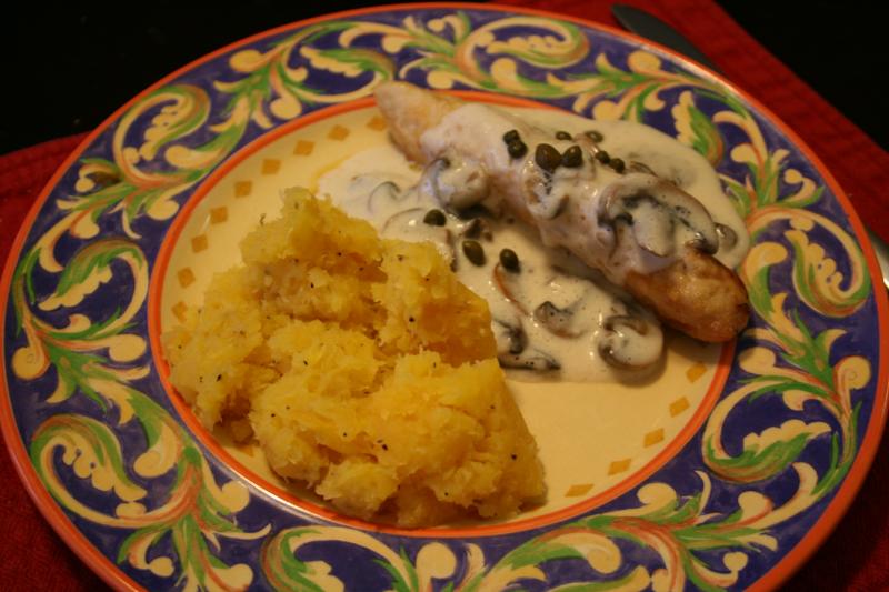 about 2T of butter and 2 T flour to make a roux, once that is ready start whisking in your milk til youve got a sauce a thinkness you like. For this sauce I added some sauteed mushrooms, fresh thyme, and a squirt of lemon juice at the end. Salt to taste.